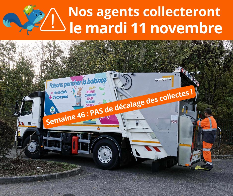 Pour rappel, nos agents collectent désormais les jours fériés (à l’exception de Noël et du Jour de l’an). Les collectes seront donc bien assurées le mardi 11 novembre.