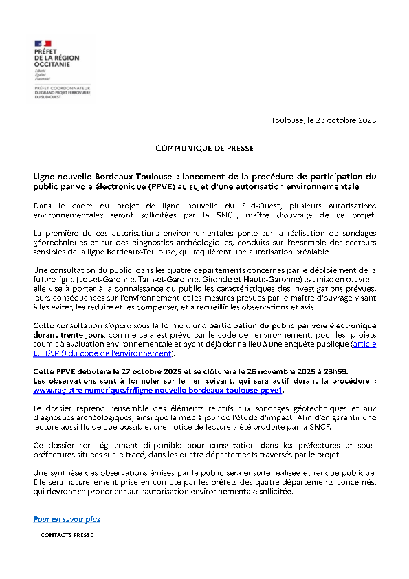 Communiqué > Ligne nouvelle Bordeaux-Toulouse : lancement de la procédure de participation du public par voie électronique (PPVE) au sujet d’une autorisation environnementale