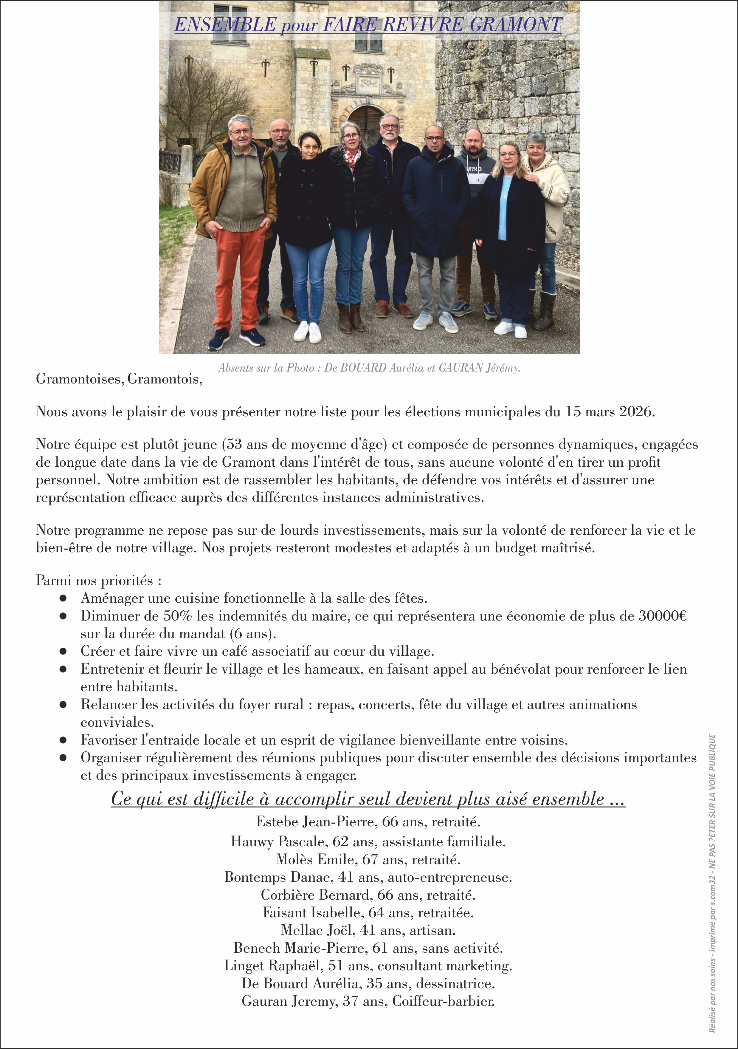 Profession de foi de la Liste "ENSEMBLE pour FAIRE REVIVRE GRAMONT"