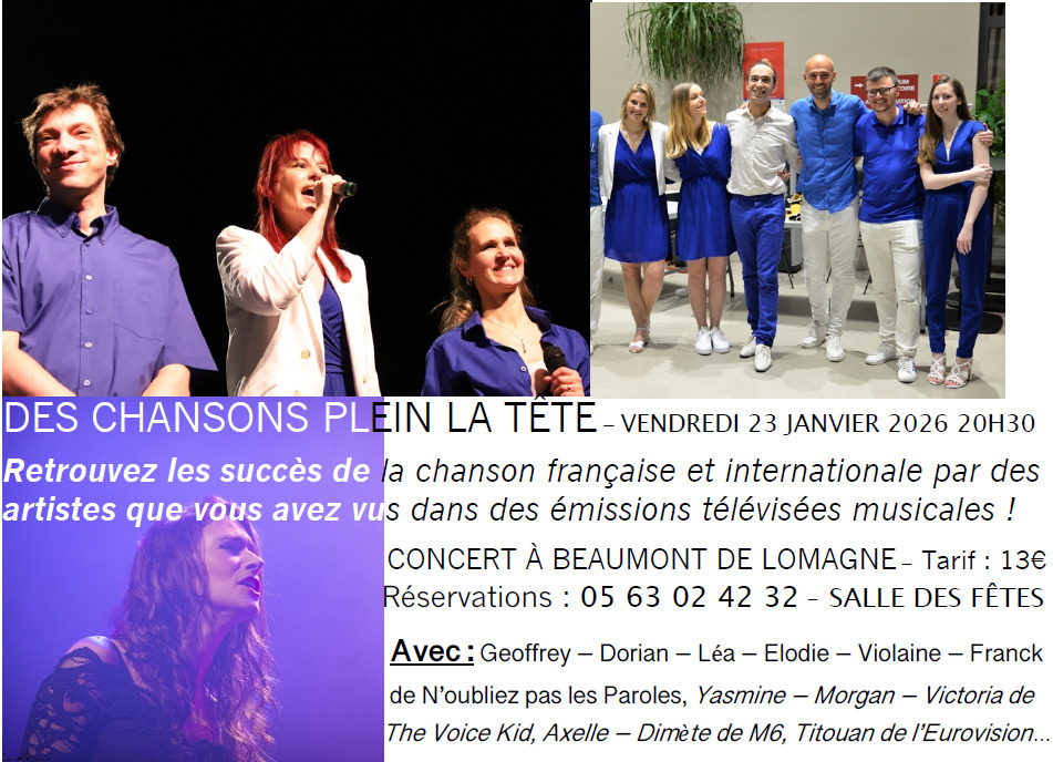 Ils sont issus d’émissions musicales télévisées célèbres, ils aiment la chanson Française et ont décidé de se rassembler pour présenter à nouveau un concert à Beaumont de Lomagne le Vendredi 23 Janvier 2026 à 20H30 à la salle des Fêtes.